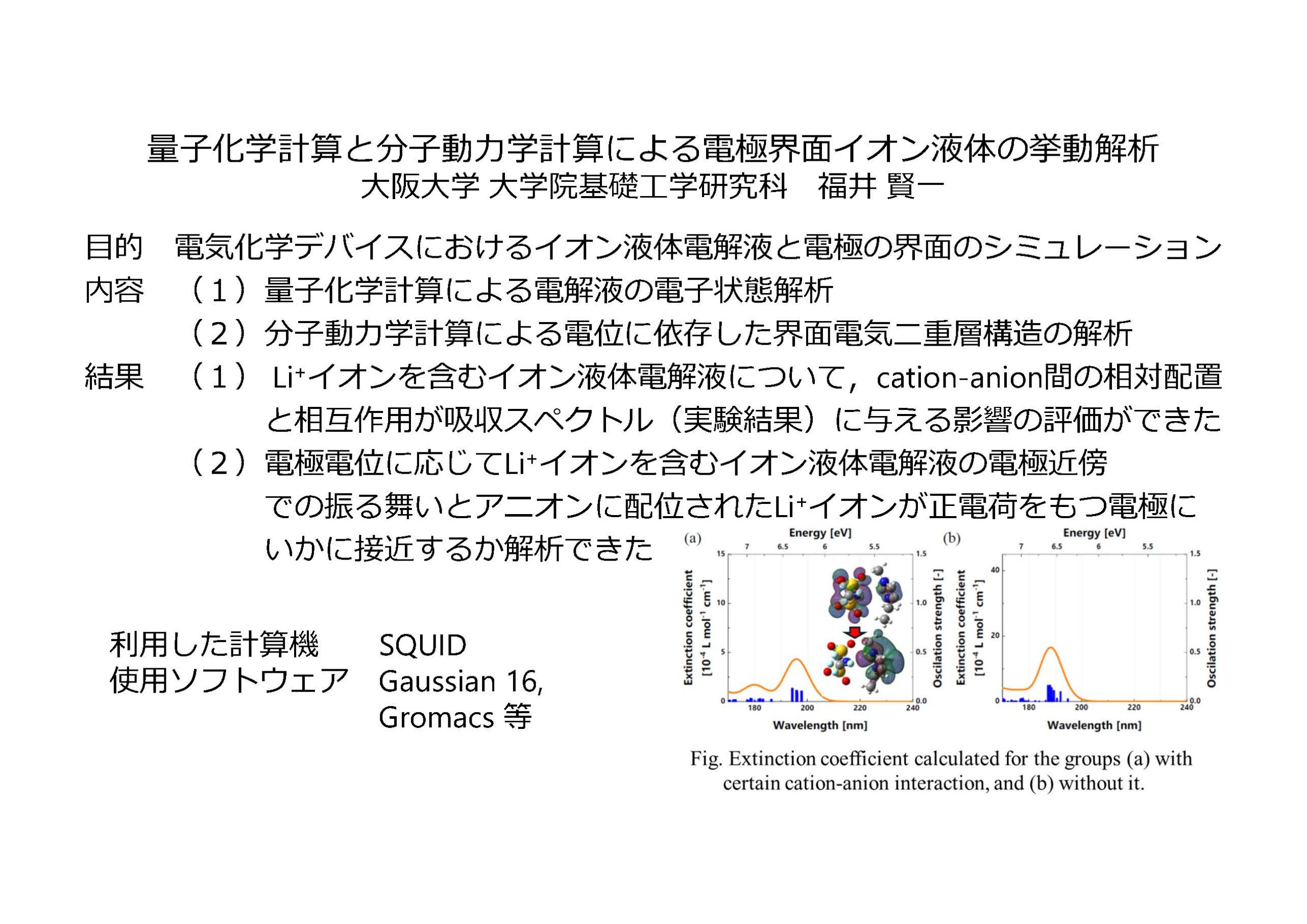 結果 (1) Li+イオンを含むイオン液体電解液について,cation-anion間の相対配置と相互作用が吸収スペクトル(実験結果)に与える影響の評価ができた