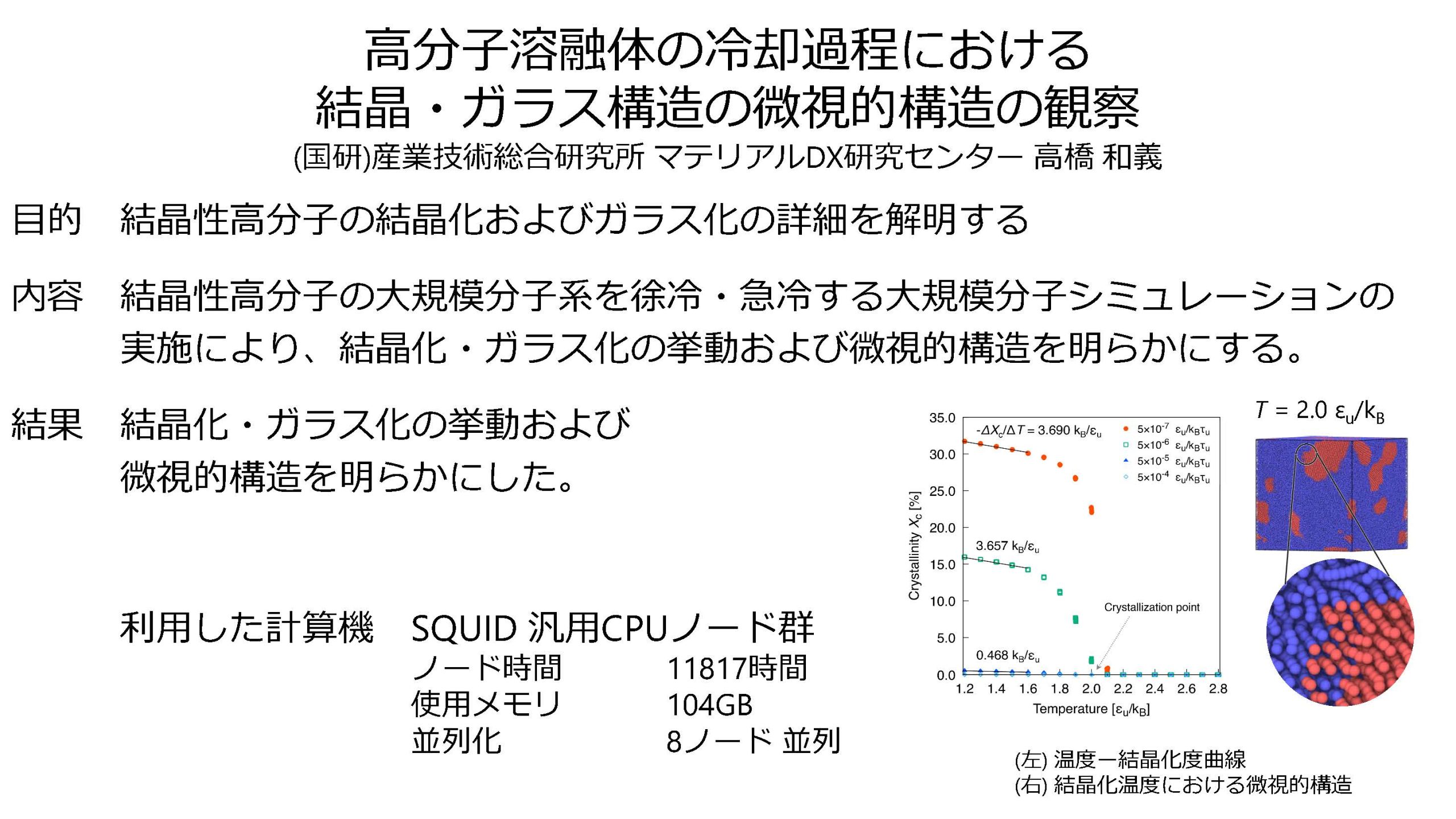Abstract:結晶性高分子の大規模分子系を徐冷・急冷する大規模分子シミュレーションの実施により、結晶化・ガラス化の挙動および微視的構造を明らかにした。