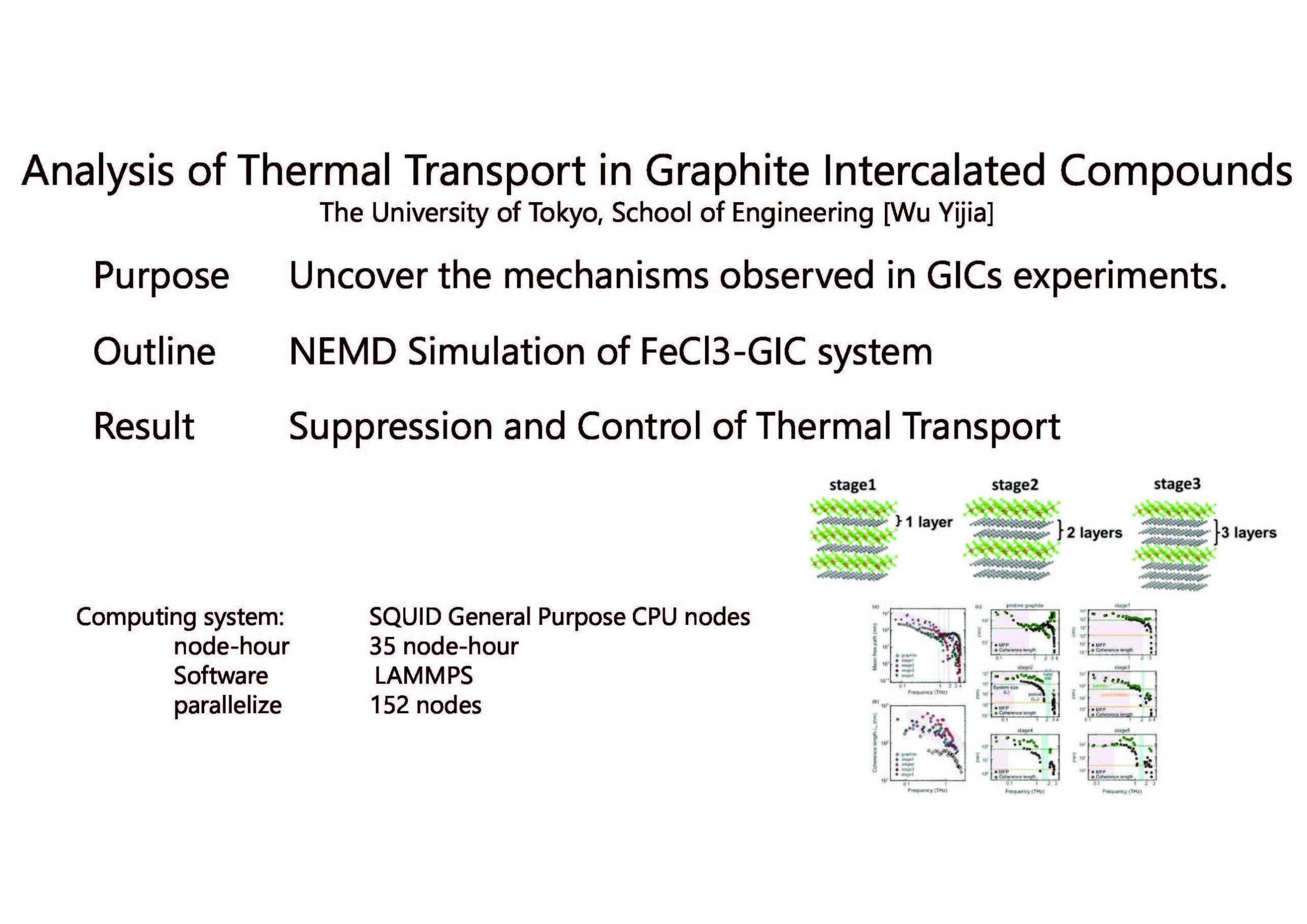 Abstract:This research explores graphite and its intercalation with FeCl3 , aiming to uncover the mechanisms underlying the extremely low cross-plane thermal conductivity observed in GICs; experiments. In this study, we employed non-equilibrium molecular dynamics simulations to investigate the thermal conductivity of FeCl 3 -graphite intercalation compounds (GIC) with various nanostructures, including different stages, thickness, and filling factor. Stage, refers to the number of graphene layers sandwiched between neighboring intercalate layers. The present work provides valuable insights into modulating the thermal properties of graphite by tuning phonon wave nature at room temperature with intercalated layered material.The observed decreasing-increasing thermal conductivity trend affirm the existence of coherent phonon transport at low stages.