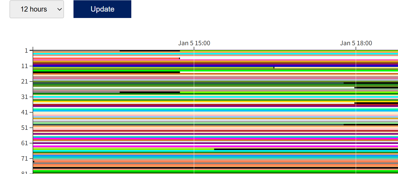 色付きのバーが使用中/スケジュール済の計算ノード、黒色のバーが空いているあるいは停止中の計算ノードです。